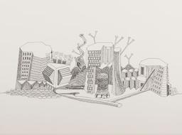 Le « Paysage au Colosse Eléphant et à la petite sculpture Serment » a été réalisé en 2019. Il fait partie de la série des « Mondes flottants », conçue comme un ensemble de paysages qui combinent constructions inventives, éléments architecturaux plus classiques et éléments inspirés des registres végétaux, animaux et géologiques. Émilie Losch crée ainsi des univers qui empruntent à la nature des représentations, des formes, pour former une esthétique urbaine hybride et poétique.