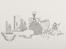 Le « Paysage au Colosse Canard et à la petite sculpture Kraken » a été réalisé en 2019. Il fait partie de la série des « Mondes flottants », conçue comme un ensemble de paysages qui combinent constructions inventives, éléments architecturaux plus classiques et éléments inspirés des registres végétaux, animaux et géologiques. Émilie Losch crée ainsi des univers qui empruntent à la nature des représentations, des formes, pour former une esthétique urbaine hybride et poétique. Le « Paysage au Colosse Canard et à la petite sculpture Kraken » présente ainsi un ensemble de structures marquées par une forte rigueur géométriques, qui figurent une fusion des registres de la construction humaine et de la nature. Le titre, descriptif, permet au spectateur d’identifier les différentes éléments constituant ce paysage, dont au centre de l’œuvre, le fameux « Colosse Canard », dont on devine la corps et le bec. Au cours de ses études artistiques, Émilie Losch se confronte à plusieurs techniques : au-delà de la peinture et de la photographie, l’artiste développe une pratique polyvalente et transversale autour de l’objet, explorant les frontières de l’art, de l’architecture et du design. Au travers de son œuvre, elle cherche ainsi à questionner le regard, le rapport du spectateur à l’espace qui l’entoure. Le travail d’Émilie Losch doit ainsi être compris comme un travail de recherche autour de la construction : elle s’intéresse à la manière dont les choses s’articulent, s’agencent, fonctionnent entre elles, en appuyant sur une dimension mathématique, à la fois pour son potentiel esthétique et pour le rôle qu’elle joue dans notre compréhension des sujets. L’artiste joue avec la matière et l’espace, tout en prenant soin d’intégrer à ses œuvres des éléments organiques (cellules, plantes, ossatures, atomes…), qui traduisent son intérêt pour le vivant dans son ensemble. Ses constructions prennent donc une forme hybride, entre urbanisme issu de la production humaine et nature. L’artiste présente ainsi son œuvre comme des « actes d’images conçus comme autant d’expériences poétiques entremêlant micro et macro, sérialité et unicité. » (Sources : https://reseau-dda.org/fr/artists/emilie-losch ; Atelier des Arques )