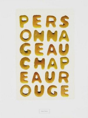 Des lettres majuscules jaune orangé sont alignées sur toute la surface de la feuille, dans une présentation qui rappelle un abécédaire. Il faut beaucoup d'attention pour constater que les lettres forment des mots et lire, avec l'aide du titre retranscrit au-dessous : "Personnage au chapeau rouge" (Gaston Chaissac). L'oeuvre fait partie de la série de Jean-Claude Loubières intitulée « 24 chef-d'oeuvres ». Chaque oeuvre reprend le titre d'une oeuvre de la peinture moderne comportant dans son titre 24 lettres. Les lettres sont découpées dans de la peau d'agrume et disposées sur le papier puis photographiées par l'artiste. Le papier est imprimé et recouvert d'un jet de paraffine pour en accentuer la netteté, comme au tout début de l'histoire de la photographie.
