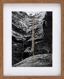 A l'occasion de son retour dans le Lot en 2017, Pierre Ardouvin en profite pour concevoir une oeuvre pour et à la demande de l'Artothèque. L'artiste s'inspire d'une gravure ancienne représentant une expédition d'exploration du célèbre gouffre de Padirac et la détourne. Extraite du fameux livre sur la spéléologie d'Edouard Alfred Martel « Les Abîmes » paru à la fin du XIXème siècle, la gravure se pare d'un bijou fantaisie qui accroche le regard par ses éclats dorés et ses strass. L'image qui nait de cette rencontre improbable évoque avec humour une sorte de fiction poétique, la mise à jour d'un souvenir, une relique de pacotille, un trésor sentimental. L'artiste mêle souvent la musique à ses oeuvres, et à cette oeuvre il joint les paroles du refrain de Rosenrot, une chanson du groupe allemand Rammstein : Tiefe Brunnen muss man graben ( On doit creuser les fontaines profondes) / Wenn man klares Wasser will (Si on veut de l'eau claire) / Rosenrot, oh Rosenrot (Rose rouge, oh rose rouge) / Tiefe Wasser sind nicht still (Les eaux profondes ne dorment pas)