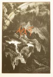 L’œuvre d’Anne et Patrick Poirier bouscule. Bien que très spectaculaire et graphique, plusieurs éléments la rendent difficile à saisir : une atmosphère qui d’emblée évoquent un temps lointain, une série d’images qui fait hésiter entre une iconographie de l’ancien testament ou de l’enfer de Dante, le noir très profond et le blanc discret rendus presque tactiles par le passage en lithographie d’une image à l’origine gravée sur bois, les titres en grecs anciens dont on ne connait pas immédiatement la signification… Si tout semble venir d’un passé mythologique ou religieux, sentiment renforcé par une présentation en triptyque, le rehaut manuel rouge du titre et le grand format de l’œuvre, qui implique une certaine technicité, viennent davantage ancrer l’œuvre dans le présent. Un récit ancien parlant de vide, de création et de destruction se superpose ainsi aux inquiétudes plus immédiates de l’époque.