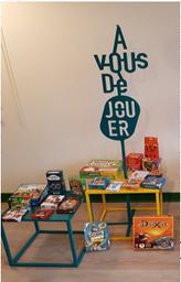2 cubes gigognes sur pied en métal thermolaqué et signalétique en vinyl autocollant (A toi de jouer). Les cubes peuvent servir de présentoirs en étalant les jeux dessus