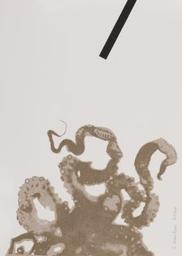 « Le rêve de la femme du pécheur » est une sérigraphie sur arches (réf : BFK Rives 300 gr), créée en 2021. L’élément principal de l’œuvre est une pieuvre qui remplit le bas de l’image. Ses tentacules dépliés sont facilement identifiables ; le jeu d’ombres indique que la pieuvre est vue de dessous, comme si le spectateur l’observait au travers d’une surface en verre. Depuis cet angle de vue, la pieuvre ignore complètement la présence du spectateur, qui entre d’une certaine manière dans son intimité : il observe la pieuvre, qui ne le voit pas. Les tentacules de la pieuvre semblent en mouvement, et le spectateur complète le tableau à partir de son imaginaire : ces tentacules rampantes, vivantes, contrastent fortement avec la bande noire qui émerge de la partie supérieure du tableau et vers laquelle la pieuvre semble se diriger. Enfin, le titre fait écho à une estampe aussi connue sous le nom de L’Ama et le Poulpe, œuvre du célèbre Hokusai et caractérisée par sa dimension érotique. Cette analogie donne à l’œuvre de Claire Dantzer une dimension évidente au spectateur qui remarque l’analogie, prêtant à cette pieuvre une dimension presque sensuelle…
