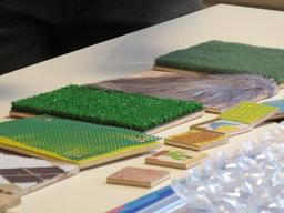 Contient : Toile pour la scène de théâtre en tissu bleu foncé. 4 carrés en tissu illustrant les scènes des différents albums de Chris Haughton. 2 marionnettes - personnages maman ours et bébé ours. 1 marionnette - chouette de l'album Un peu perdu. 1 marionnette - George le chien de l'album Oh non, George !. 1 marionnette d'oiseau en tissu (Chut ! On a un plan). 4 bonnets (Chut ! On a un plan). 2 coffrets d'instruments de musique (éveil) pour les effets sonores du théâtre. Tour 10 cubes, notion de la taille des animaux. Document printable pour construction d'une marionnette du petit ours. Piques en bois (pour fabrication de la marionnette). Colle ( pour fabrication de la marionnete). Scotch (pour fabrication de la marionnette). Pastels (pour fabrication de la marionnette). 1 livret du module. 1 caisse à livres .