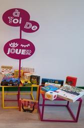 2 cubes gigognes sur pied en métal thermolaqué et signalétique en vinyl autocollant (A toi de jouer). Les cubes peuvent servir de présentoirs en étalant les jeux dessus